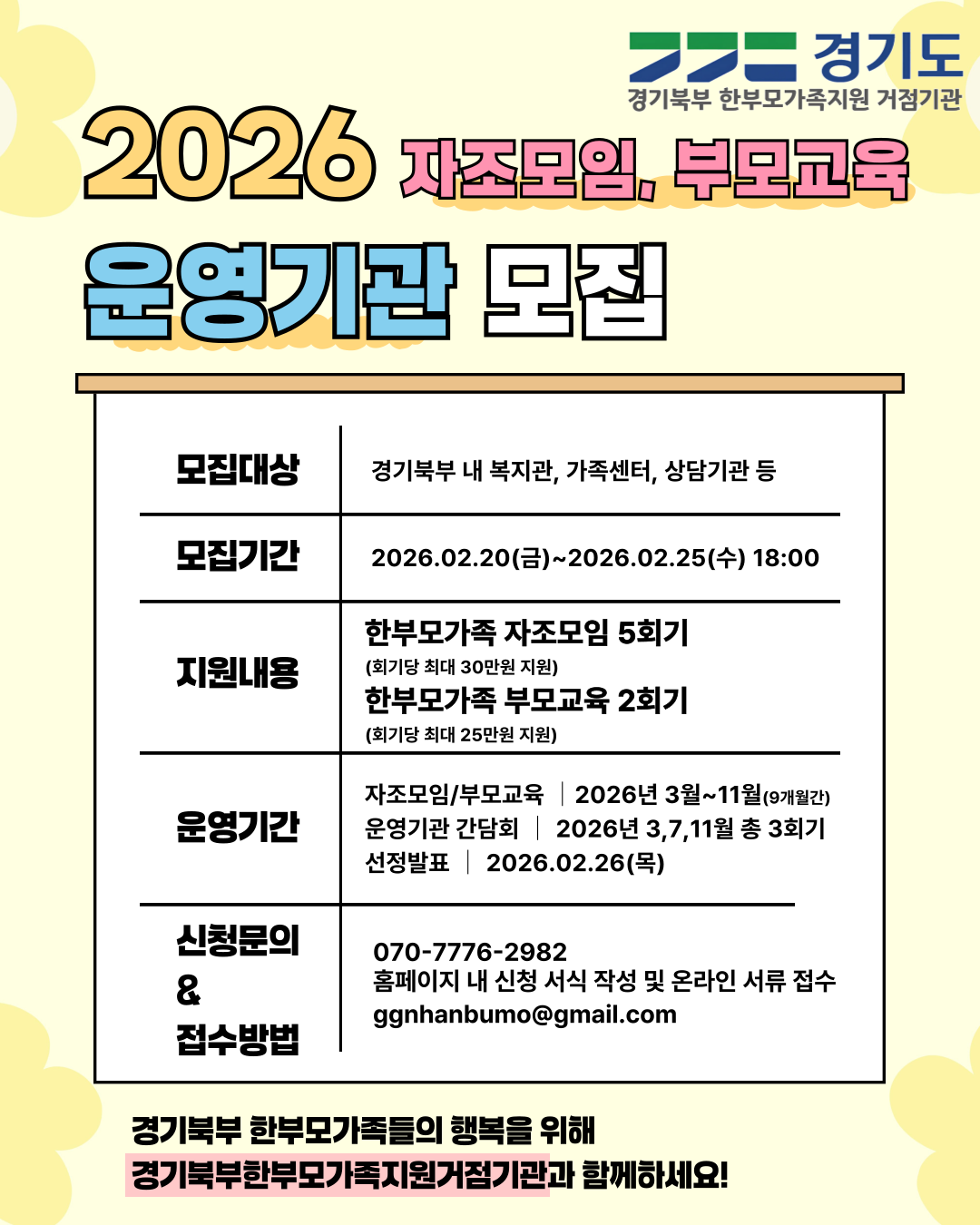 운영기간 : 자조모임,부모교육 ㅣ 2026년 3월~11월(9개월간)