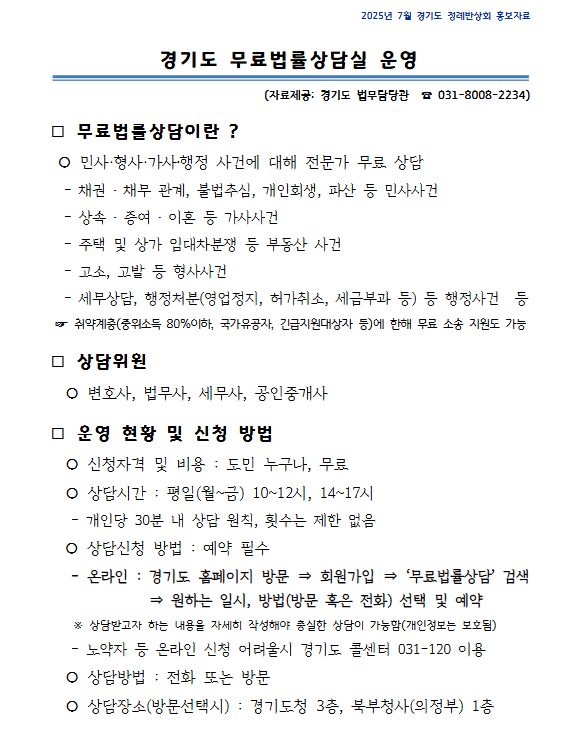 법적으로 어려움이 있으신 분들은 경기도 무료 법률 상담실로 문의하시고 상담 받아 보세요.