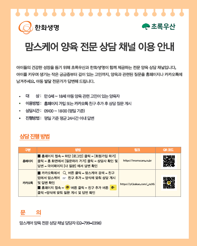 초록우산 어린이재단은 후원처 한화생명과 함께 맘스케어 양육 전문 상담 채널을 운영하고 있으며,