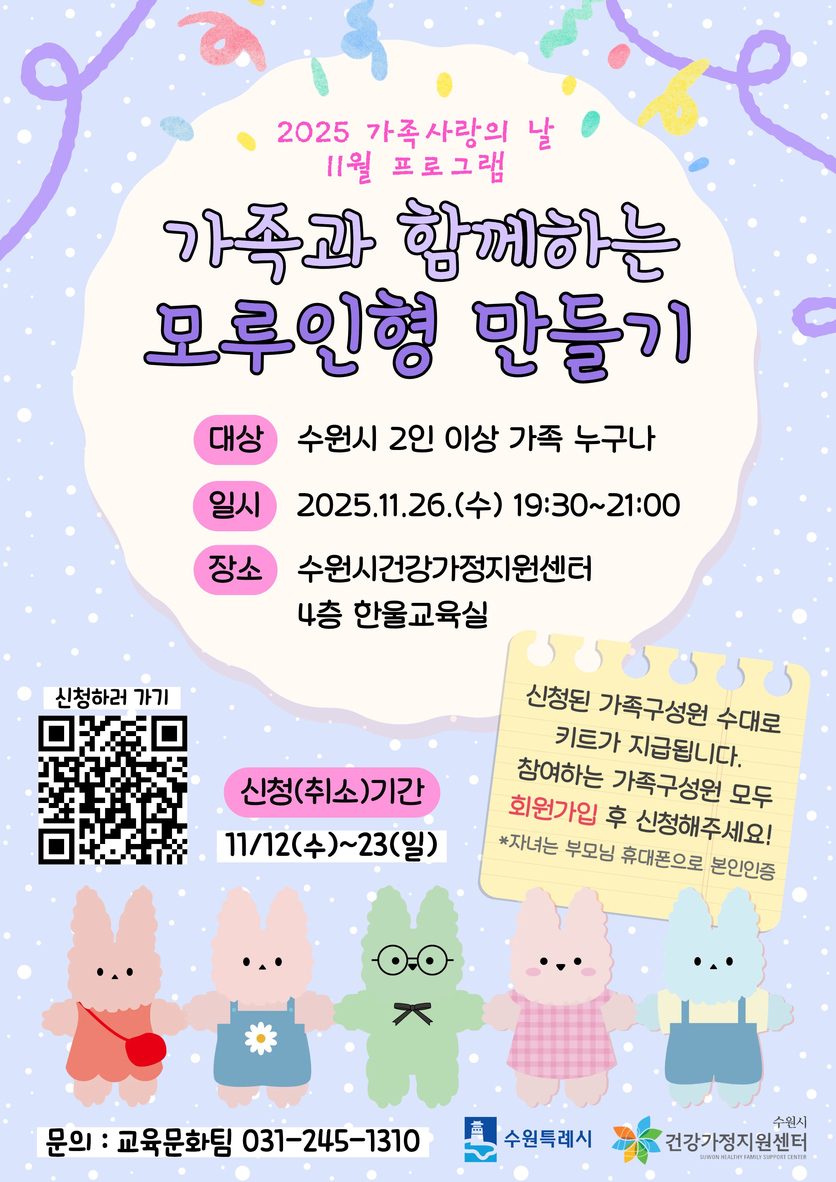 수원시 건강가정지원센터에서 11월 가족사랑의 날 '가족과 함께하는 모루인형 만들기' 참여자를 모집한다고 합니다.