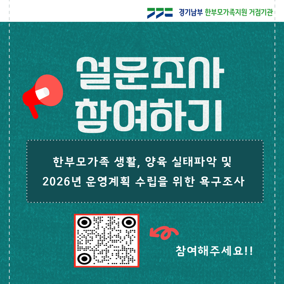 본 설문은 2026년 경기남부 한부모가족지원 거점기관 운영을 위한 욕구를 파악하기 위한 것이며 모든 응답은 익명으로 처리되며, 통계 목적 외에는 사용되지 않습니다.