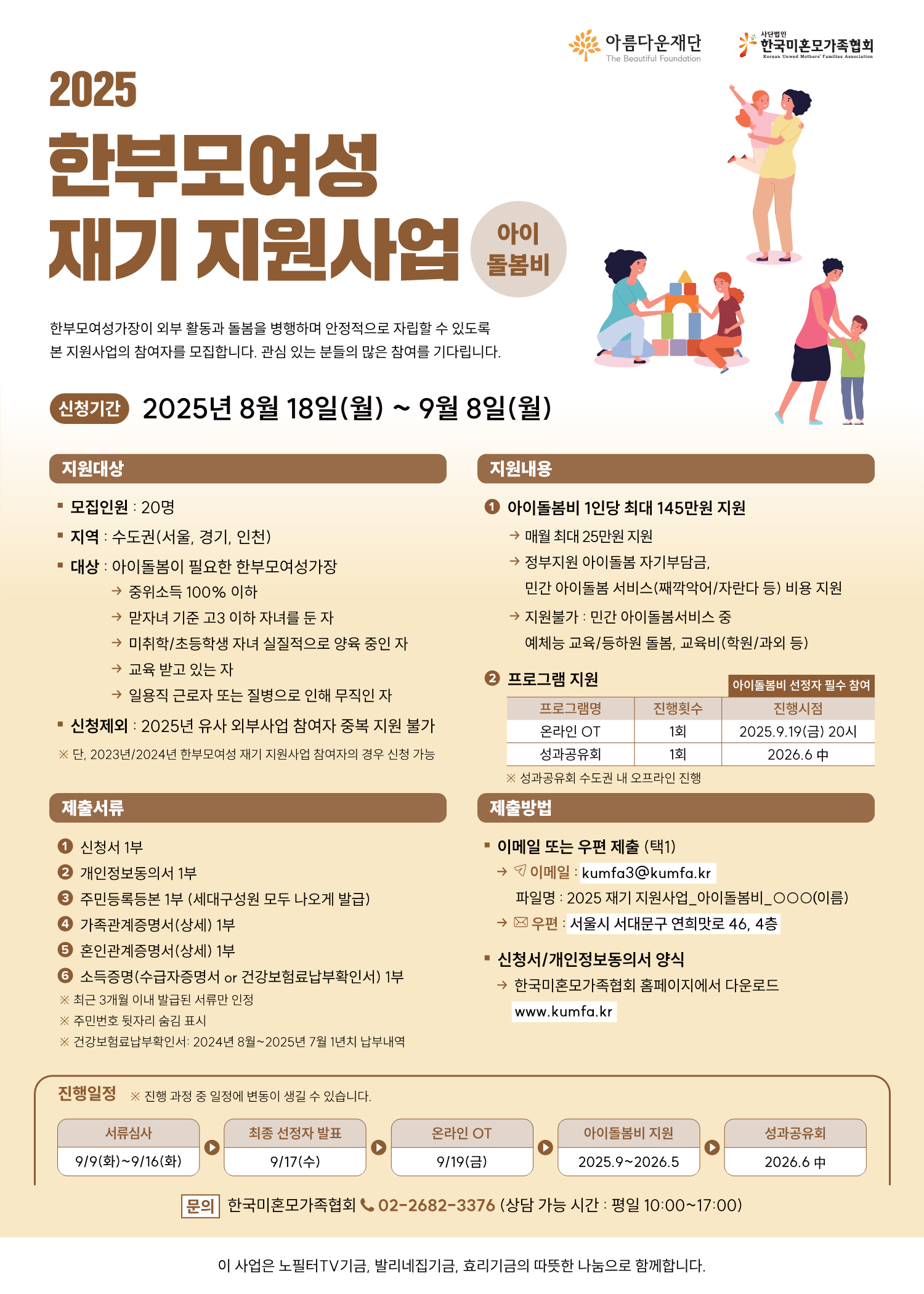 사단법인 한국미혼모가족협회에서 2025년 한부모여성 재기지원사업 "아이돌봄비 지원" 대상자를 모집한다고 합니다